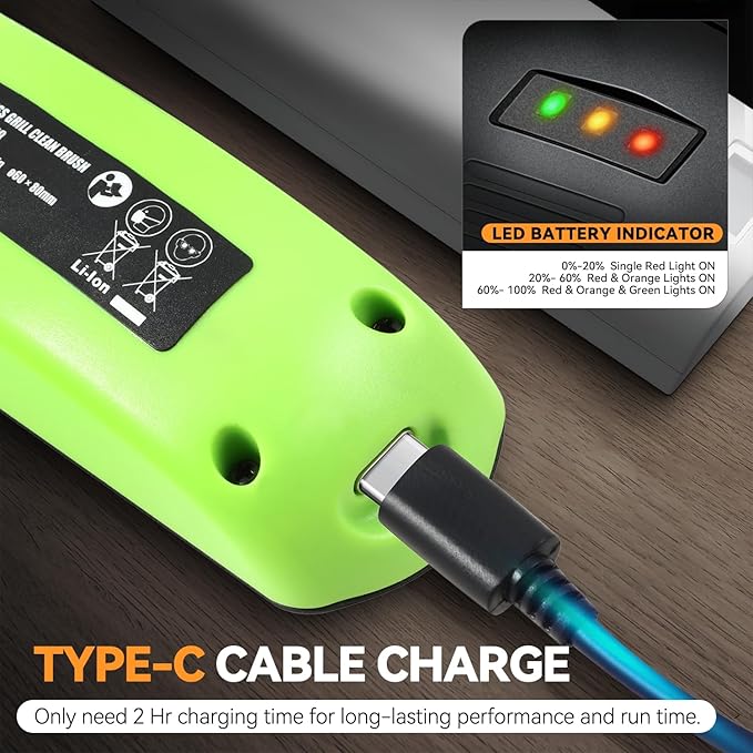 - 【Cordless and Portable】Free from the constraints of power cords, this handheld power BBQ grill scrub brush offers cordless convenience. It charges via Type-C cable, requiring only 2 hours of charging time for long-lasting performance and runtime.