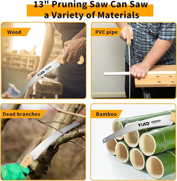 - Efficient Tree Trimming and Wood Cutting:The Yiad 13" Hand Pruning Saw features a sharp, curved blade designed for fast and precise cuts. Whether you're trimming tree branches in the yard or preparing firewood during camping trips, this handsaw delivers exceptional performance, saving time and effort