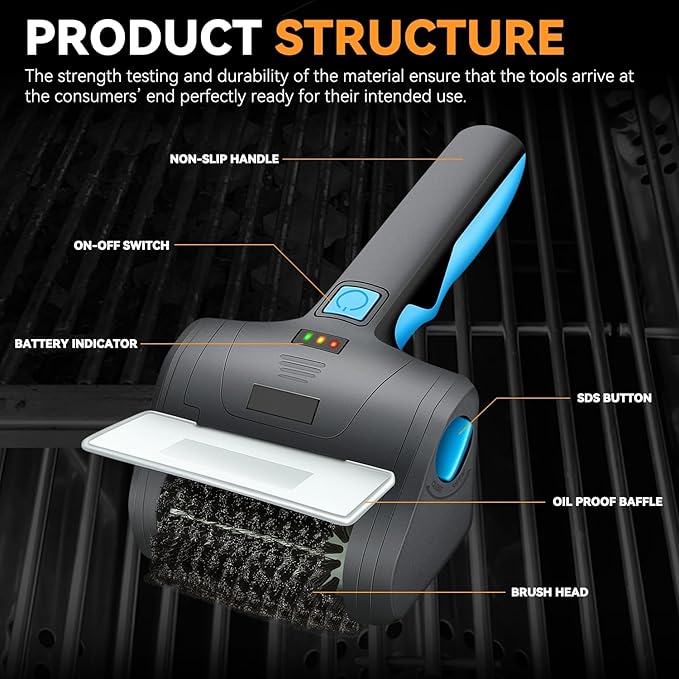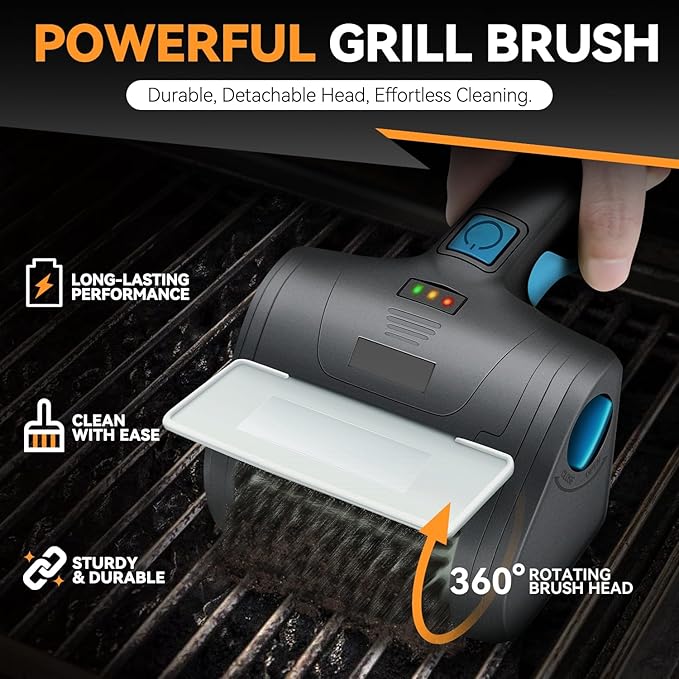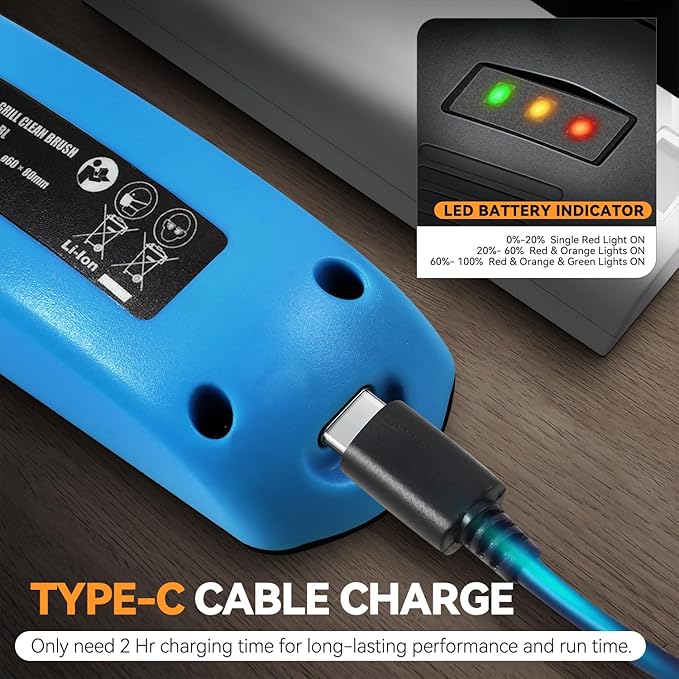 - 【Cordless and Portable】Free from the constraints of power cords, this handheld power BBQ grill scrub brush offers cordless convenience. It charges via Type-C cable, requiring only 2 hours of charging time for long-lasting performance and runtime.