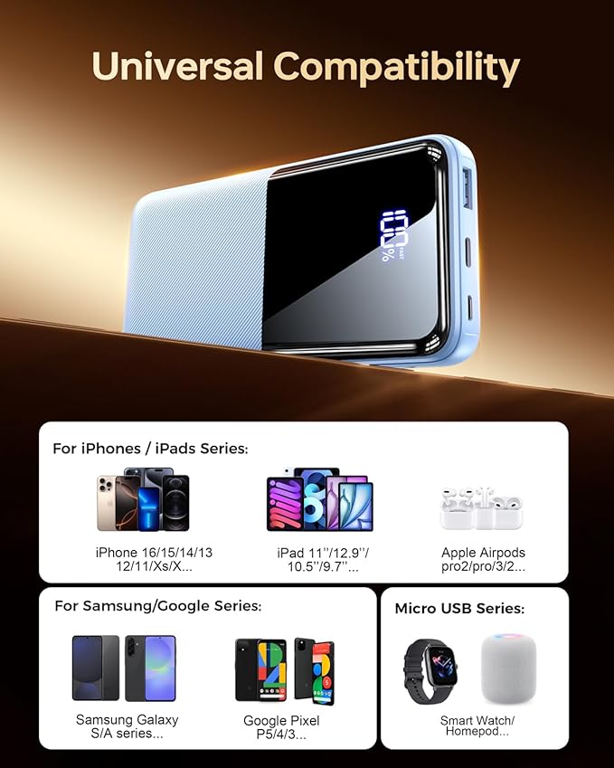 - Wide Compatibility battery pack with 2 Built-In Cables: This portable charger comes with integrated cables for Type C, iOS, and 3 input ports (Micro USB, Type-C, USB-A), ensuring compatibility with a wide range of devices like iPhone 17/17 Pro/ 17 Pro Max/17 Air/16/16 Pro/16 Pro Max/15/15 Pro/15 Pro Max/14/13/12, Samsung Galaxy, Google Pixel, tablets, iPad series, earbuds, smartwatches, and and other Android, tablets.