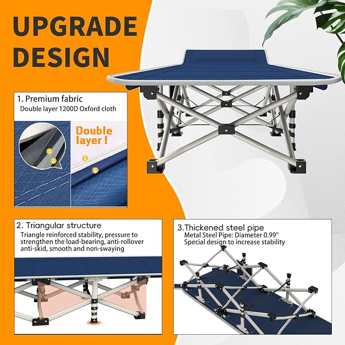 - 【Premium Fabric】The camping cots for adults is made up of double-layer 1200D Oxford fabric for superior strength, water resistance and easy cleanability, with side pockets that can easily accommodate your phone or keys.