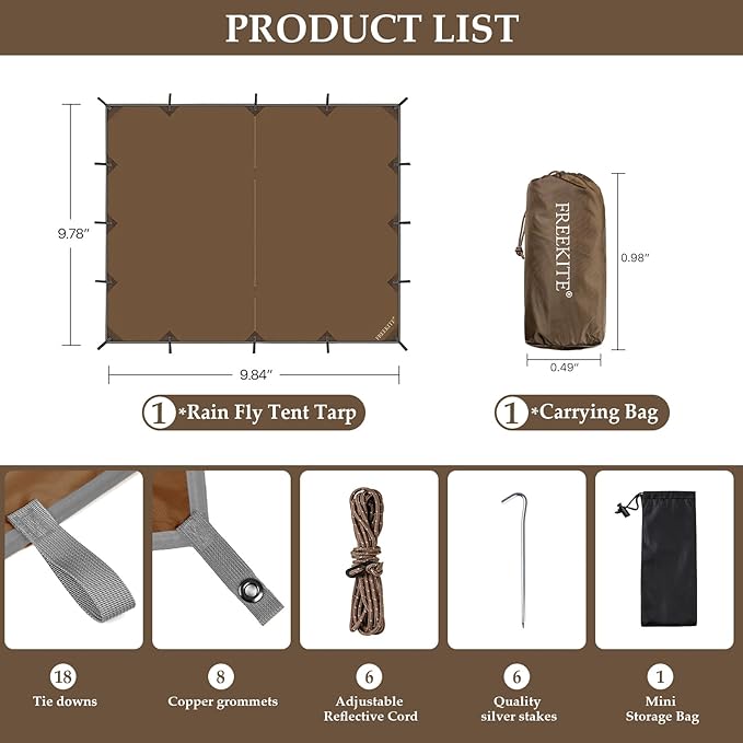 - [MULTI-OCCASIONS]:The waterproof portable FREEKITE camping tarp is suitable for any occasion,such as tactical use,military applications,shelters,hunting,fishing,backpacking,travel,hiking,work,camping,and other outdoor adventures