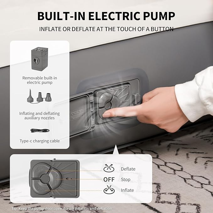 - UPGRADED PATENTED BUILT-IN PUMP: Rechargeable built-in pump with 3-minute one-touch inflation or deflation frees up your hands and gets you comfortable on your mattress in the time it takes for a cup of coffee. Comes with Type-C charging cable and three types of nozzles, the air pump can be removed separately to inflate other air mattresses or inflatable pillows