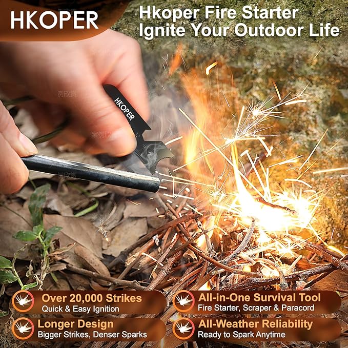 - Ferro Rod Fire Starter Survival Tool: The Hkoper fire starter kit includes a 6" ferro rod, a versatile 6-in-1 scraper, a durable paracord, and an emergency whistle—everything you need for survival in one compact kit