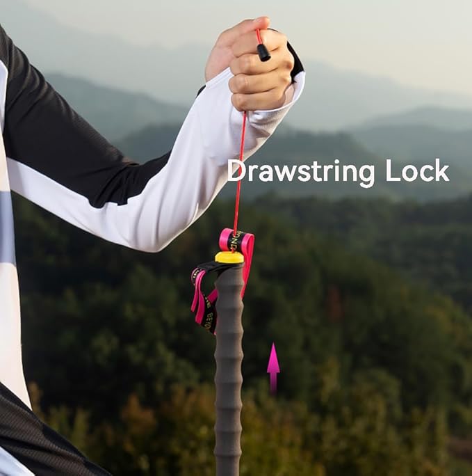 - 【Drawstring Locking Technology】Collapsible hiking poles feature drawstring locking technology, which makes it easy to adjust and lock into place in just a few seconds. Simply pull upward to securely hold the poles in place and prevent them from slipping, providing you with ultimate stability.