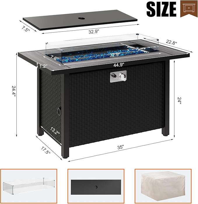 45 inch Outdoor Propane Fire Pit 50,000 BTU Gas Fire Pit Table with Lid, Glass Wind Guard, Waterproof Cover, Rectangle Gas Firepit Table for Garden/Patio, CSA Certification