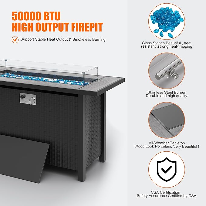 - Perfect Heater: With no hassle of smoke, ash, mess, heave wood bundles being carried, just need to turn on the knob, this fire pit table would give off a very nice from low to high flame. And it can reach to 50000BTU with CSA certification, keeping you in a warm and safe atmosphere