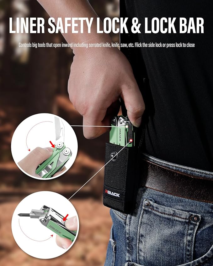 - SECURE SELF-LOCKING MECHANISM: Featuring a robust self-locking mechanism, RBLACK multitool pliers guarantees a secure and stable operation for various tasks, every tool and knife ( except the pliers heads ) will be locked security when fully open