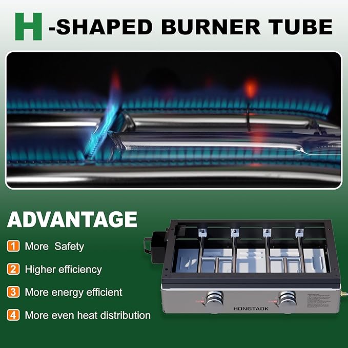 - Eco-Friendly & Safety: Special H-burner can make the fuel mix with air fully, higher combustion efficiency, energy-saving and environmentally friendly, stable flame, so that the heat is evenly distributed on the whole baking tray. Made of high quality stainless steel, stronger and more resistant to rust and corrosion.