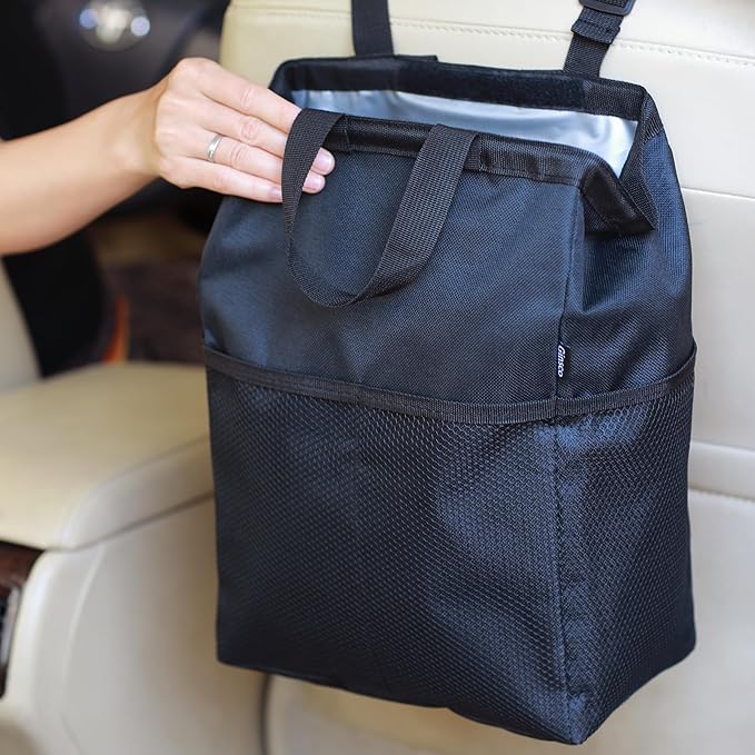 - EXTRA STORAGE SPACE : Car trash bag comes with mesh pockets on the outside of the trash bin for storing small items like wipes, water bottle, snack packs etc. Trash can for cars can be used as a car storage bag, car organizers, car stuff, car gadgets, makes everything well organize.