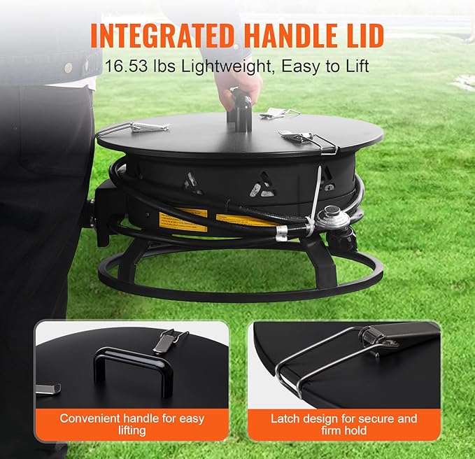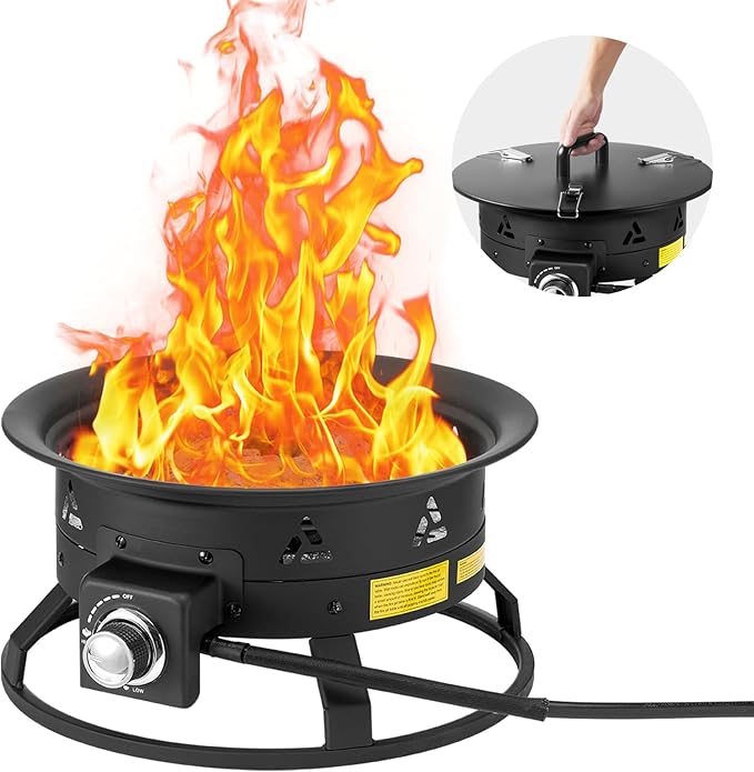 VEVOR Portable Propane Fire Pit, 19-Inch Diameter Outdoor Gas Fire Pit with Cover & Lava Rocks, Adjustable Flame Height Camping Firepit for Heating, Lighting, Gathering, 58,000 BTU, Black