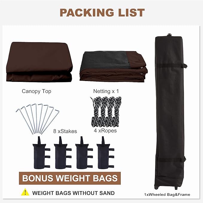 - 【Package Includes】: 1 Canopy Frame, 1 Canopy Top, Mosquito Netting, 4 Sand Bags, 4 Ropes, 8 Stakes and 1 Wheeled Bag, which is crafted of 600D PVC coated fabric with reinforced handles.