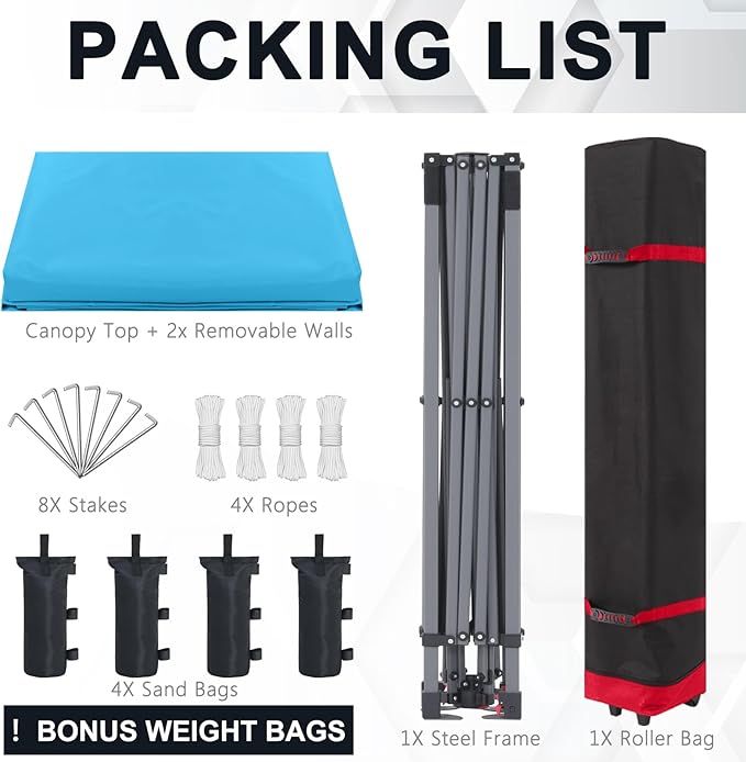 - 【PARTS INCLUDED】Fully assembled powder-coated steel frame,oxford fabric silver coated canopy top,2 Removable Side Walls,600D heavy stock wear resistant roller bag,4Xsand bags,8Xstakes and 4Xropes