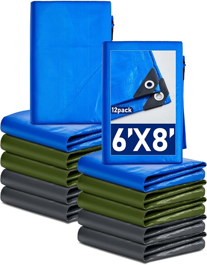 12 Pcs Large Waterproof Tarp 6 x 8 ft Heavy Duty 5.5 Mil Thick Poly Tarpaulin with Grommets Multipurpose Protective Cover for Summer Home Boats Cars Camping Rv Pool Tent