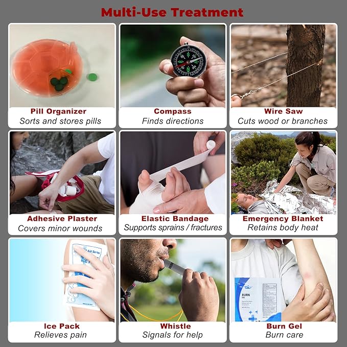 - WHAT YOU GET ▶Raismile first aid kit contains 505 professional medical supplies including Various bandages, compass, scissors, gloves, CPR face shield, emergency poncho, and more. Perfect for homes, businesses, outdoor activities, and travel emergencies