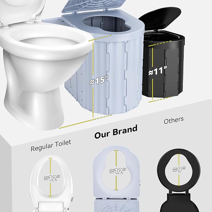 - 【Upgrade Heightening Portable Toilet】Upgraded foldable portable toilet with larger size - 15.2*12.4*14.4inch - More convenient to use. It's among the tallest units in its category, and this is a lifesaver if you've any knee issues. It is higher wider, the larger size and wider portable toilet for adults brings a more relaxed experience. Very suitable for male, female etc.