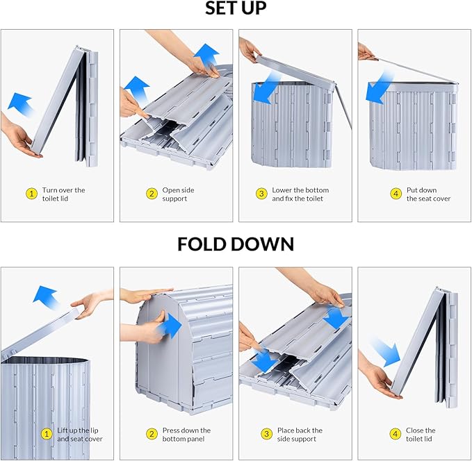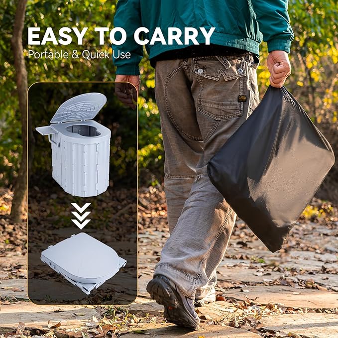- 【Easier to Use and Portable】This porta potty for camping can be easily set up and fold down in seconds, convenient for quick use in emergency situations. Porta potties come with garbage bags and bio gel, which helps to solidify liquid waste. Cleanup and disposal are much easier, as a result. It also comes with a disposable toilet seat, which makes it more hygienic for you to use.