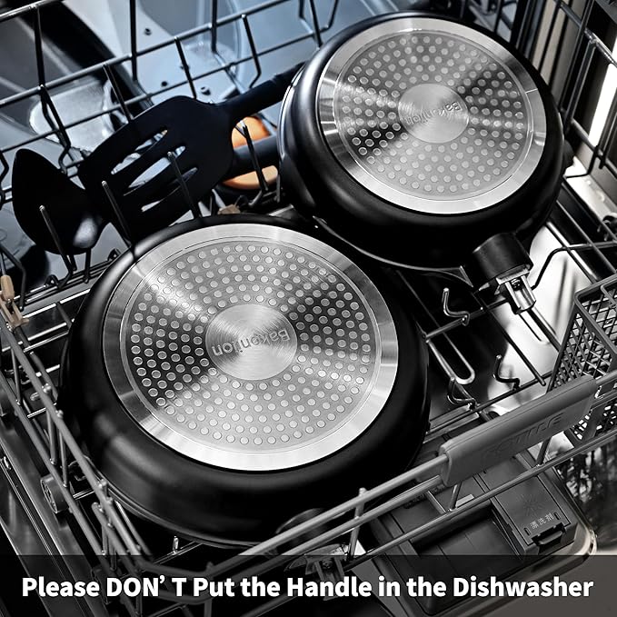 - Compatible with All Stovetops-These nonstick frying pans are friendly with induction cooktop, gas stovetop and electric stove, the cast aluminum construction ensures better heat distribution and longer heat preservation. Both handwash and dishwasher are suitable, in order to prolong the pan performance, handwash is recommended.(Oven safe up to 500℉)-Please DON'T put the handles in the oven.