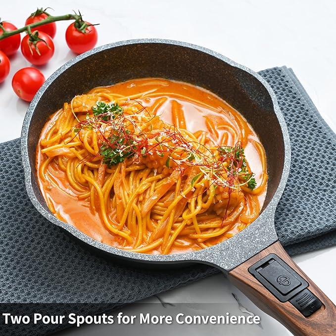 - Two Pour Spouts and Perfectly Versatile-Ideal kitchen pans for all kinds of cooking tasks, the pour spouts on BOTH sides of the pan's edge are really handy. They cook things evenly and quickly, making eggs,pancakes,crepes,meat,poultry,gravy,omelets,vegetables, bacon, steak, salmon, roast turkey, and other things without sticking.
