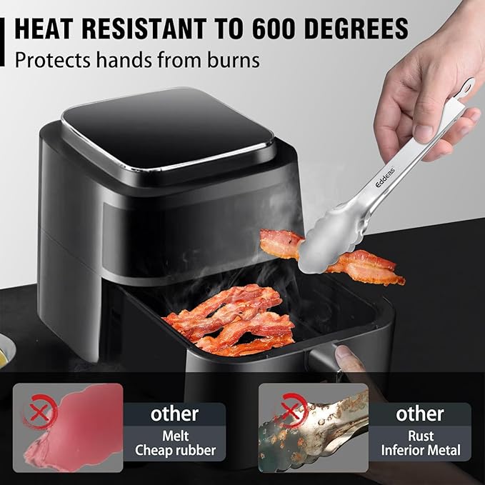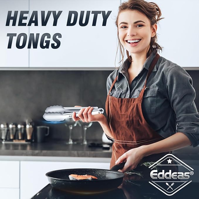 - FOOD-GRADE STAINLESS STEEL - EDDEAS kitchen tongs are made of 1mm thick food-grade stainless steel in one piece for enhanced robustness and heat resistance, rust resistance and easy handling. Tongs for cooking the overall light weight and ergonomic features are maintained.