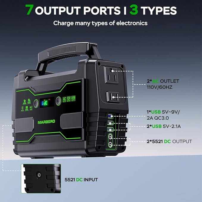 - Ultra-Portable & Compact Design: Measuring just 8.34 x 3.62 x 7.4 inches and weighing only 3.7 lbs, the MARBERO M155 power station is exceptionally lightweight, portable, and compact. Perfect for camping, hunting, RV trips, or even backyard gatherings, it slips effortlessly into your backpack or vehicle storage without taking up space. Stay powered on the move,wherever adventure takes you.