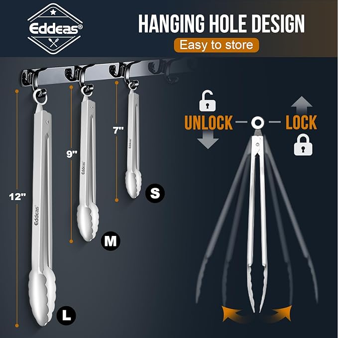 - 3 SIZE 7", 9" & 12 in MULTIPLE APPLICATION - Eddeas metal tongs will meet your needs for safety and stability, for everyday kitchen tasks or outdoor use, Used with various meats, salad, sliced fruits, rolls, burger toppings, and fettuccini.