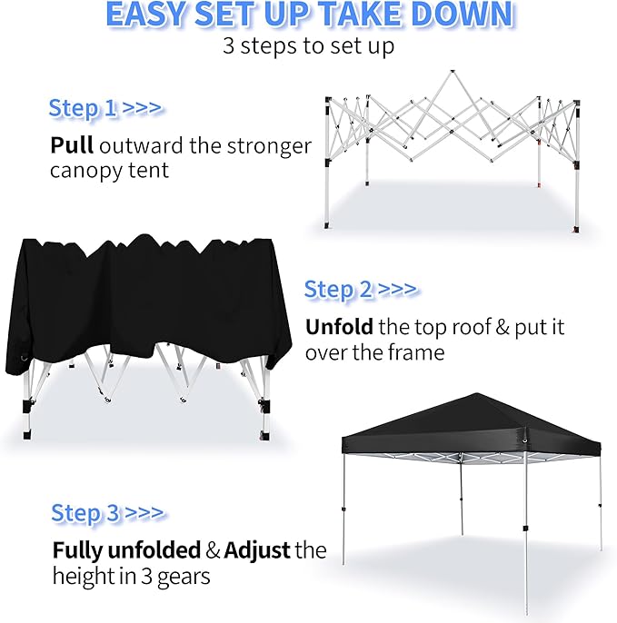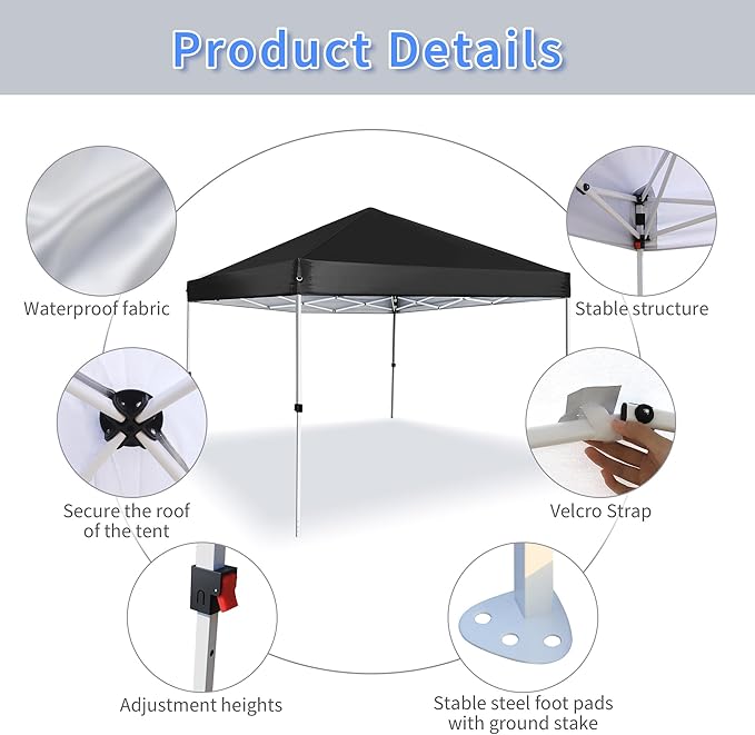 - Adjustable Height & Angle - With adjustable straight leg heights, this canopy offers the flexibility to adapt to different terrains and usage scenarios. Whether you're hosting a party on a sloped lawn or setting up for a commercial event, you can easily customize the height and angle to meet your specific needs.