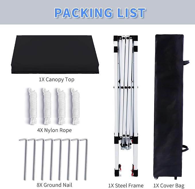 - Quick Setup & Complete Package - This canopy tent is designed for effortless setup, requiring no special tools. It comes with 8 sturdy ground stakes and 4 durable wind ropes, ensuring your shelter is securely anchored in any weather condition. The clear and concise design makes storage a breeze when not in use.