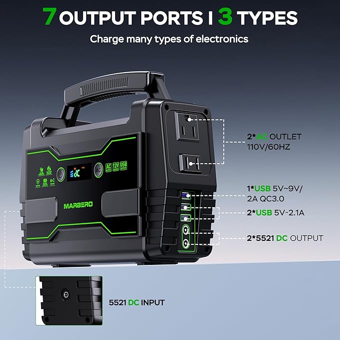 - Included Components : 1*15V/2A Power Adapter, 1*Car Charger, 1*User Manual, 1*Cigarette Lighter Adapter, 1*MARBERO 155Wh Portable Power Station, 1*MARBERO Portable Solar Panel 30W 1*15V/2A Power Adapter, 1*Car Charger, 1*User Manual, 1*Cigarette Lighter Adapter, 1*MARBERO 155Wh Portable Power Station, 1*MARBERO Portable Solar Panel 30W