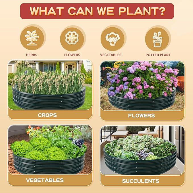 - 【DURABLE & STABLE】: ZBZBML round raised garden bed (5×5×1ft) is 60 IN Diameter,11.8IN Tall, each is made of 0.7MM thick Q195 galvanized metal sheet painted, double-layer anti-corrosion galvanizing and round structure design,it is built to providing a solid foundation for your plants.