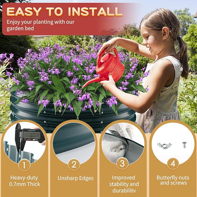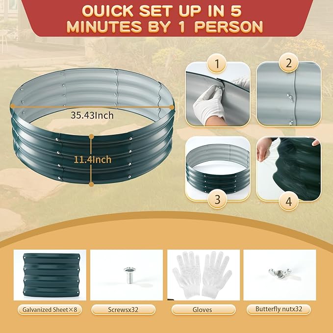 - 【DURABLE & STABLE】: ZBZBML round raised garden bed (3×3×1ft) is 36 IN Diameter,11.8IN Tall, each is made of 0.8MM thick Q195 galvanized metal sheet painted, double-layer anti-corrosion galvanizing and round structure design,it is built to providing a solid foundation for your plants.