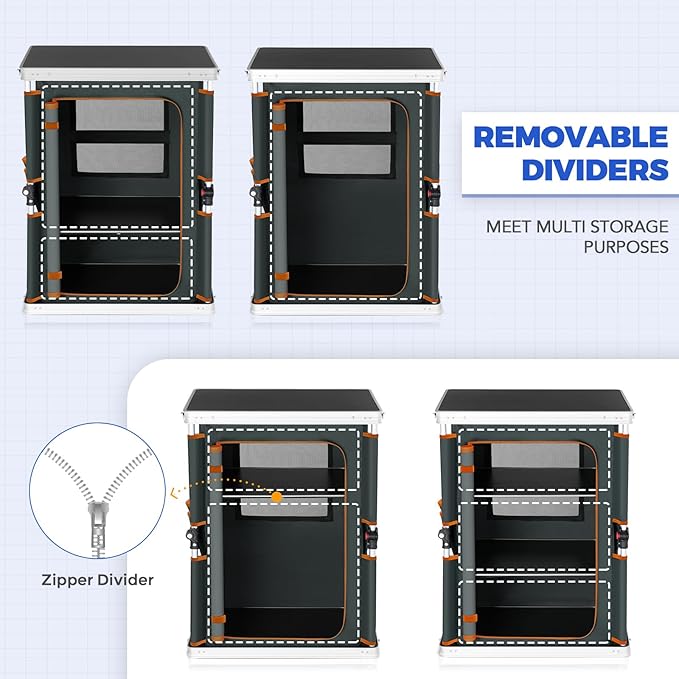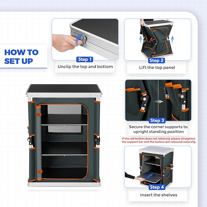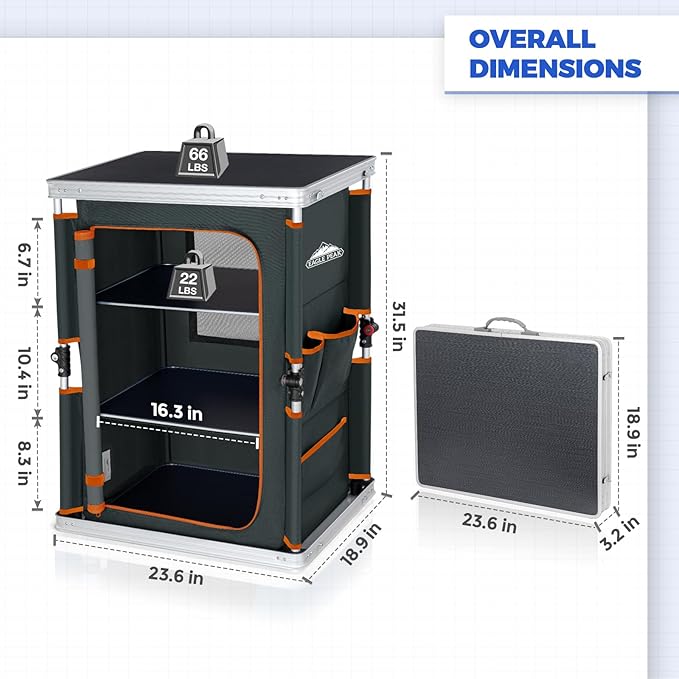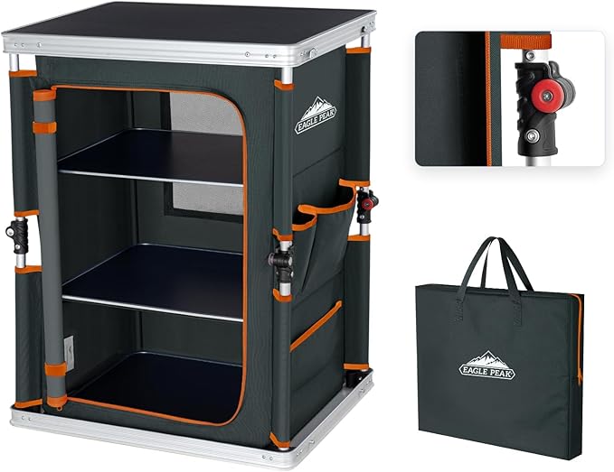 - BREATHABLE & EASY TO CLEAN: EAGLE PEAK portable camping table’s waterproof desktop and the 3 level shelves can be conveniently removed to clean when dirty. 2 mesh backside windows provide breathable airflow. NOTE:the table should not be used in the rain.