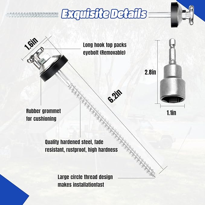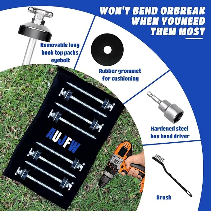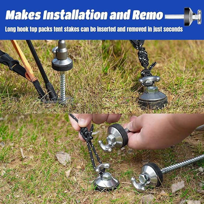 - Ease of Use:Metal hook tent stakes designed to be used with a cordless drill or impact driver, makes installation and removal process fast, no matter what terrain go in just as easily as they come out can. They are perfect for use through "O" or "D" rings at the base of tents, canopies, awnings or any other product that has an opening of 10mm or larger, firmly support your outdoor equipment