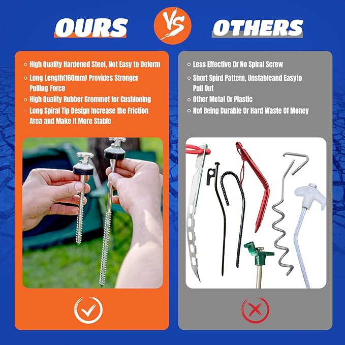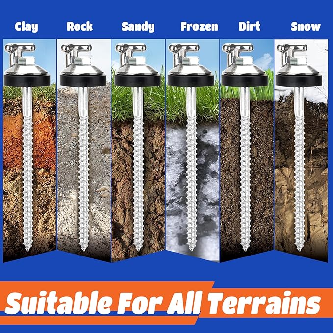 - Strength and Security: Drillable threaded tent stakes is spiral tip and long hook top packs design, provides excellent grip and stability within any ground type. Ordinary tent stakes simply don’t provide the same level of security or stability