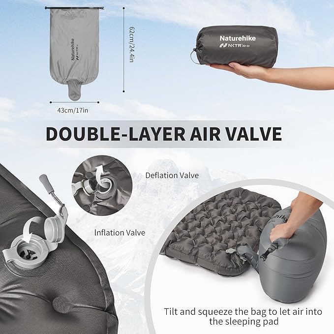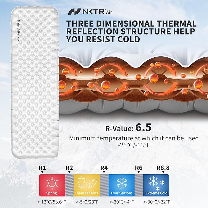 - 6.5 HIGH R-VALUE INSULATION: Naturehike ultralight air mattresses have a high R-value of 6.5 for warmth and insulation. Suitable for temperatures above -13°F/-25°C. 10cm ( 3.94in ) thicker design, both high resilience and anti-compression and shock absorption, peace of mind to block the ground