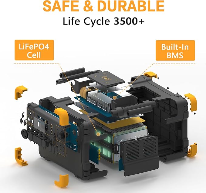 - Portable Power Station -- [SAFETY & DURABLE]: The ultra-safe LiFePO4 battery with Built-in BMS assures the self-protection of short circuits, overload, and overheating. 110V Pure-sine wave inverter makes sure there is no damage to your sensitive electronic devices.