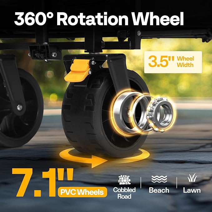 - 360° SWIVEL WHEEL: This collapsible wagon features four 6.5-inch PVC all-terrain wheels built to handle hard sand, grass, and all kinds of complex ground; The rear wheels are equipped with two brakes, providing stability when parked on slopes; This cart will become your assistant in trivial garden work, helping you haul various flowers, fertilizers, and gardening supplies with ease