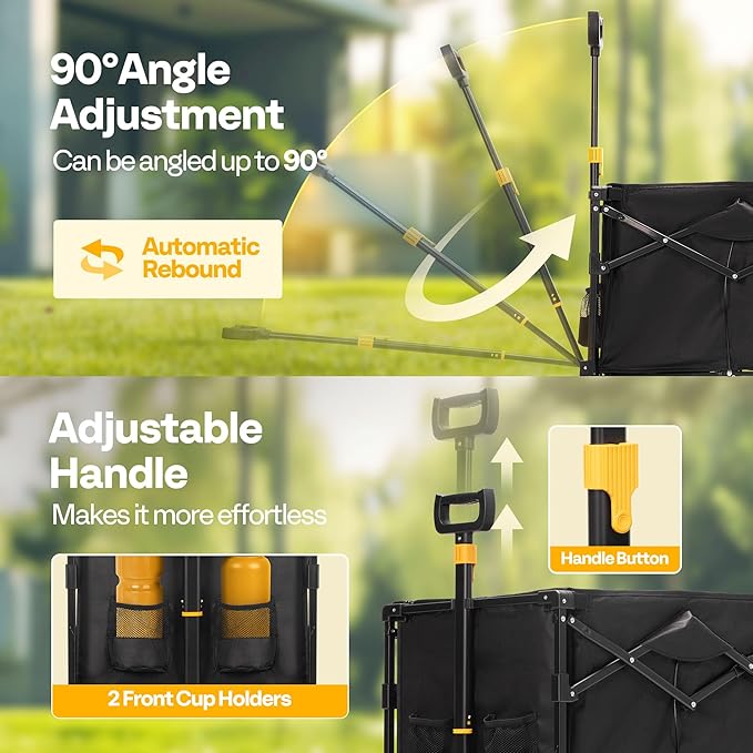 - FLEXIBLE HANDLE: The handle of the folding cart is adjustable and can be angled up to 90° in both upward and downward directions; With an extended adjustable handle, the wagon can be easily maneuvered even when carrying heavy loads, ensuring a smooth and effortless pulling experience