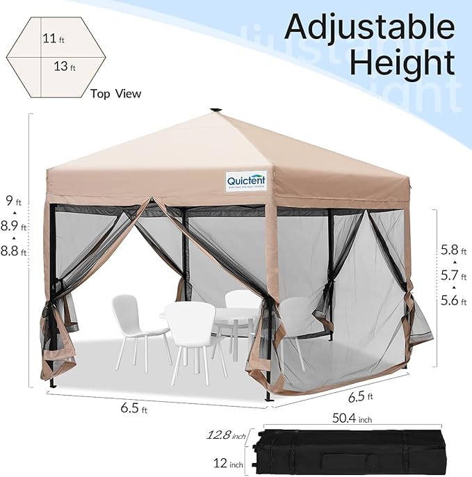 - NICELY SEALED NETTING: The 13’x13’ pop up canopy with 360 degree velcro strap sewn along the cover and sidewalls fully sealed to keep unwanted elements away. There're also no gaps between the sidewalls,as the screened canopy tent comes with 3 pieces of mesh sidewalls which covers 6 sides and connects with zippers.