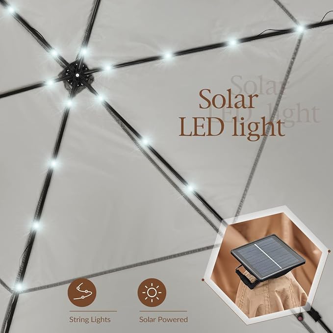 - SOLAR LED LIGHT:Our screened canopy features with sun powered LED lights, which create the perfect atmosphere for your outdoor living at day and night. The lights are clamped on the frame, and there is no need to take down for storage. They can last 20 hours when it’s fully charged.