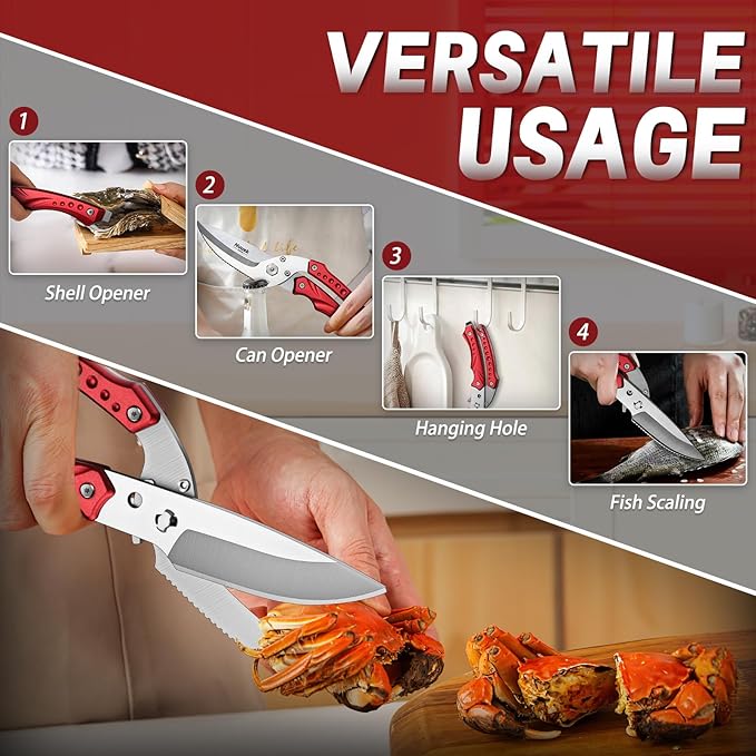 - All in One: Not only ensuring smooth cutting through meat, bones, and seafood, the poultry scissor also has serrated edge to quickly removes fish scales. A built-in nut and shell cracker in the handle and an integrated bottle opener add even more convenience. Take your kitchen to the next level with the professional-grade chicken shears, designed for maximum functionality