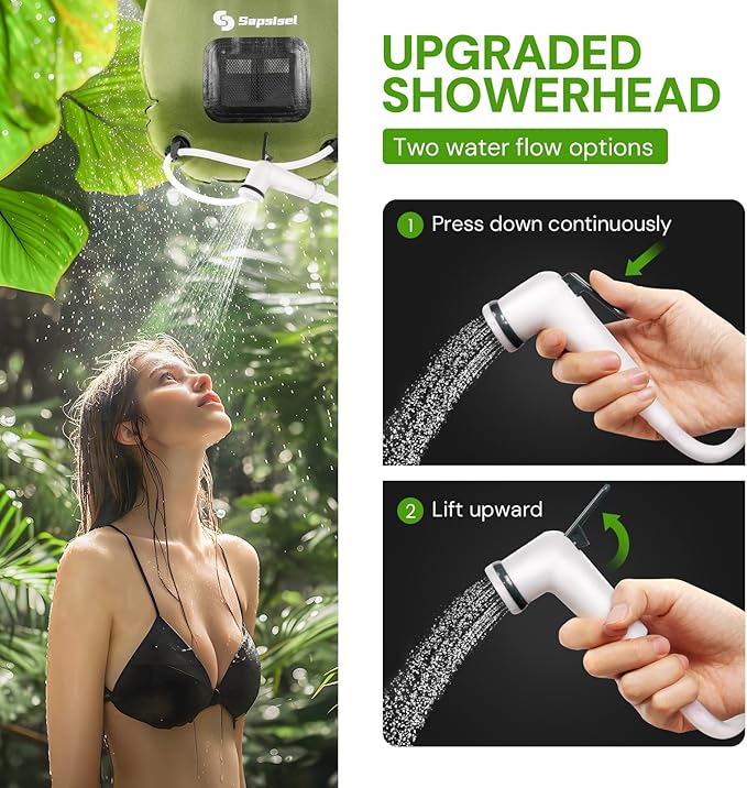 - 【Upgraded Shower Head】Enjoy ultimate convenience with an upgraded shower head, featuring an easy-to-use on/off switch for effortless control. You can adjust the water flow to your preferred intensity, ensuring a personalized solar shower experience. This camp shower is a must-have for any camping enthusiast, offering the great solution for your camping shower needs.