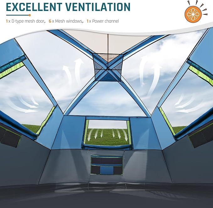 - Water Resistance & E-Port: Our outdoor tent offers robust water resistance with a rainfly, taped seams, a tent skirt, and waterproof fabric. Plus, the rain-resistant E-Port makes it easy to access power inside the tent, keeping your devices charged and ready to use.