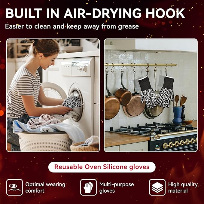 - VERSATILE AND PRACTICAL — Perfect for grilling, cooking, frying, and baking, these gloves offer good dexterity with their fingered design. The fingered design ensures great dexterity, ideal for kitchen and outdoor tasks. They provide solid heat resistance and flame-retardant protection to help you handle hot surfaces safely. While they resist flames, direct and extended contact with fire can damage the gloves’ outer appearance and reduce their performance