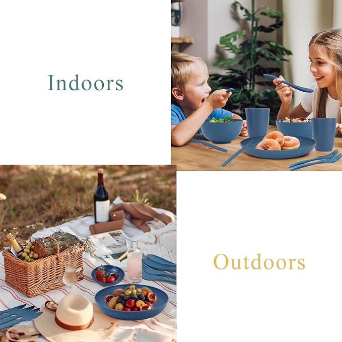 Wheat straw plates and bowls sets with cutlery - Unbreakable wheat straw dinnerware sets - Dishwasher safe plates,bowls,cups for apartment.Blue