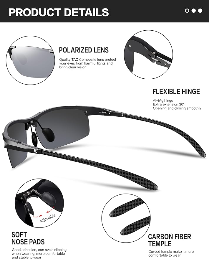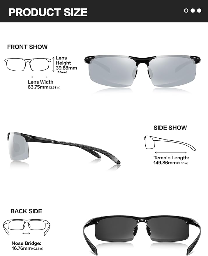 - Al-Mg Alloy Frame+Carbon Fiber Temple: Mg-Al metal frame mens sunglasses have good texture,are 30% extra lighter than ordinary metal shades,polarised sunglasses are made from carbon fiber are often more resistant to wear and tear, bending, and breaking compared to the sunglasses made from other materials. We apply those advanced materials to sunglasses whose weight is only 24g, so it's comfortable to wear for extended periods.