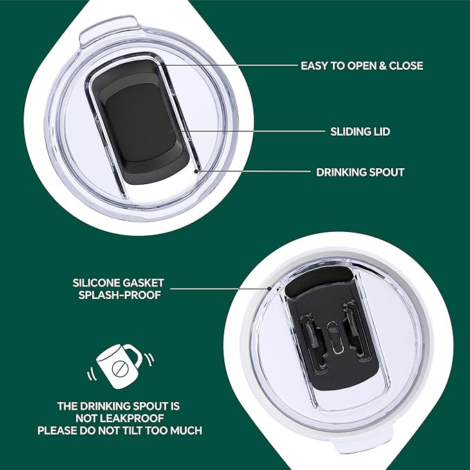 - SPILL-PROOF LID - Designed by a professional team of designers, our slider lids facilitate sipping with just a gentle touch. They effectively prevent splashing and spilling; however, it is advisable to avoid turning them upside down as they are not entirely leak-proof.