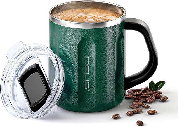 Ideus 16 oz Coffee Cup, Stainless Steel Coffee Travel Mug, Spill Proof Tea Mug with Handle and Lid, Lightweight and Durable, Great for Office Home and Outdoor Use, Deep Green