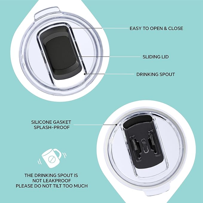 - SPILL-PROOF LID - Designed by a professional team of designers, our slider lids facilitate sipping with just a gentle touch. They effectively prevent splashing and spilling; however, it is advisable to avoid turning them upside down as they are not entirely leak-proof.