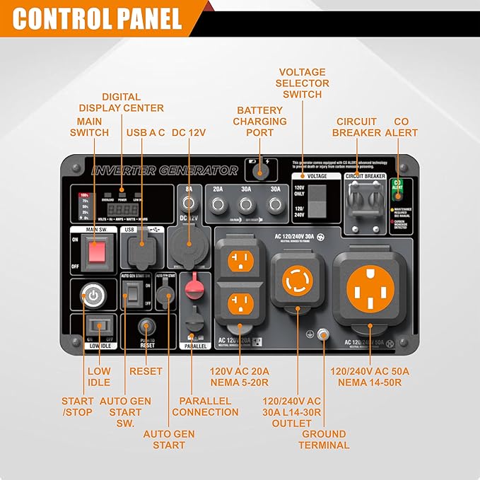 - 【Intelligent Control Panel, 2 wire Start】: The generator's control panel combines multiple functions with cutting-edge technology and user-friendly design. Direct current outputs paired with USB ports meet the charging needs of various digital devices. Multi-functional digital displays provide real-time operational parameters for easy monitoring. Features such as battery charging port, 2 wire automatic start/stop to charge solar batteries, and parallel operation capabilities offer intelligent solutions for complex power scenarios. The CO alarm function ensures safety, while voltage switching accommodates different electrical standards for seamless operation.